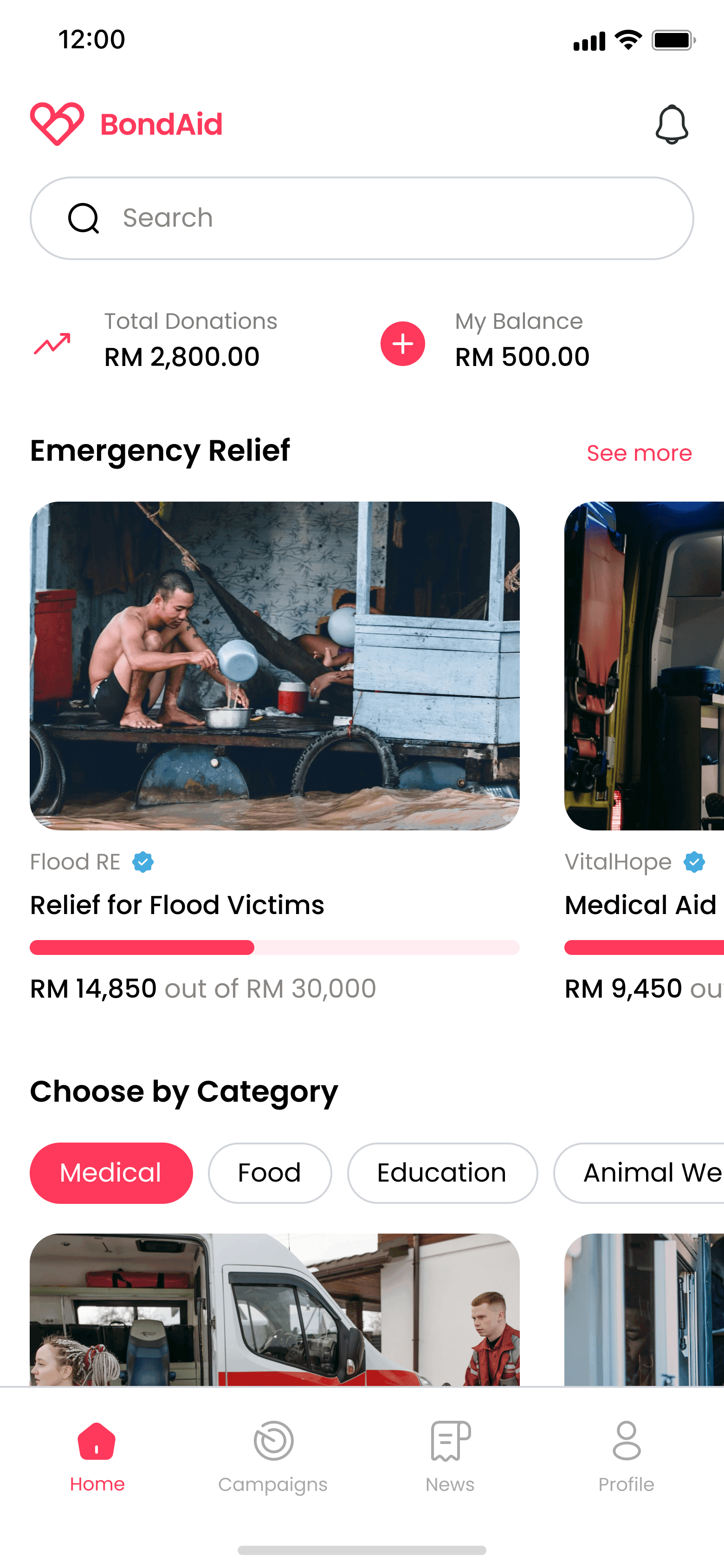Bondaid is a mobile app designed to make donating simple and transparent. Users can easily find causes to donate to, track their total contributions through an e-wallet, and monitor their donation history. The design focuses on a user-friendly experience, encouraging consistent engagement and making charitable giving straightforward and rewarding.
