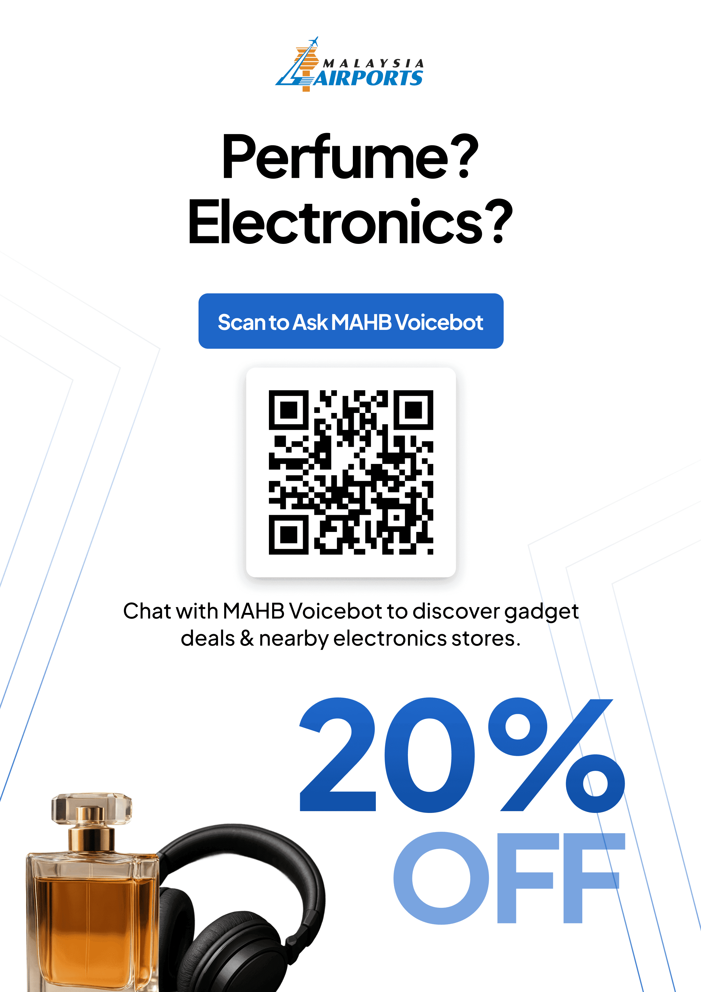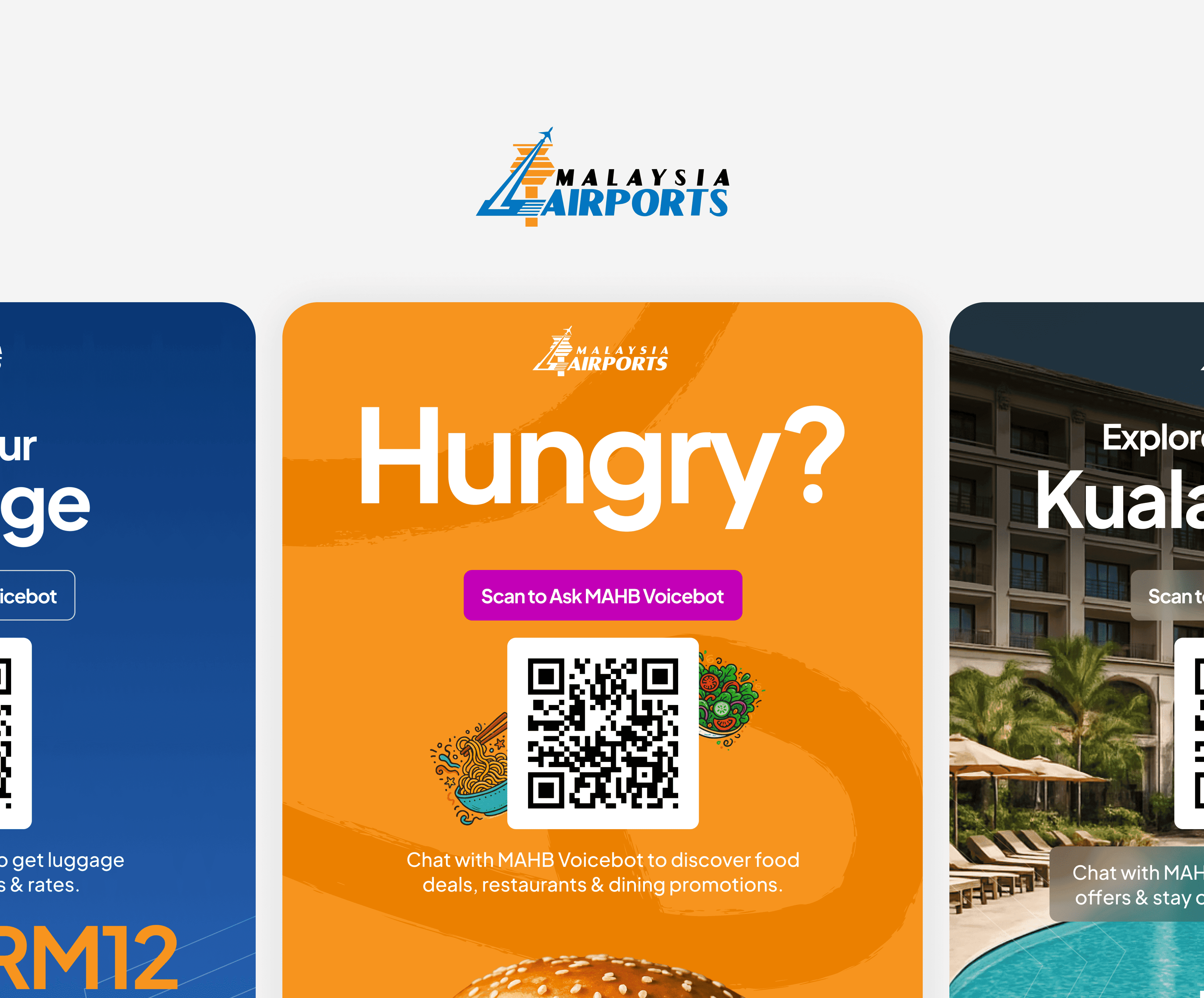 We proposed an AI voicebot for Malaysia Airports and showed how it can be used effectively. I designed posters with the QR code in the center, making it easy for travelers to scan and interact—e.g., “Hungry? Scan this QR code and talk to our bot.” The posters clearly explain the voicebot’s purpose and encourage usage.